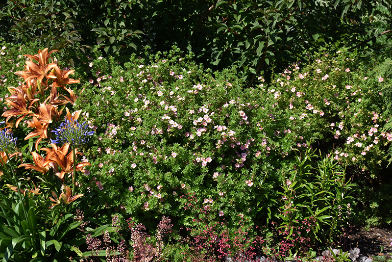 Pink Beauty Potentilla will grow to be about 3 feet tall at maturity, with a spread of 3 feet. It tends to fill out right to the ground and therefore doesn't necessarily require facer plants in front. It grows at a slow rate, and under ideal conditions can be expected to live for approximately 30 years.
