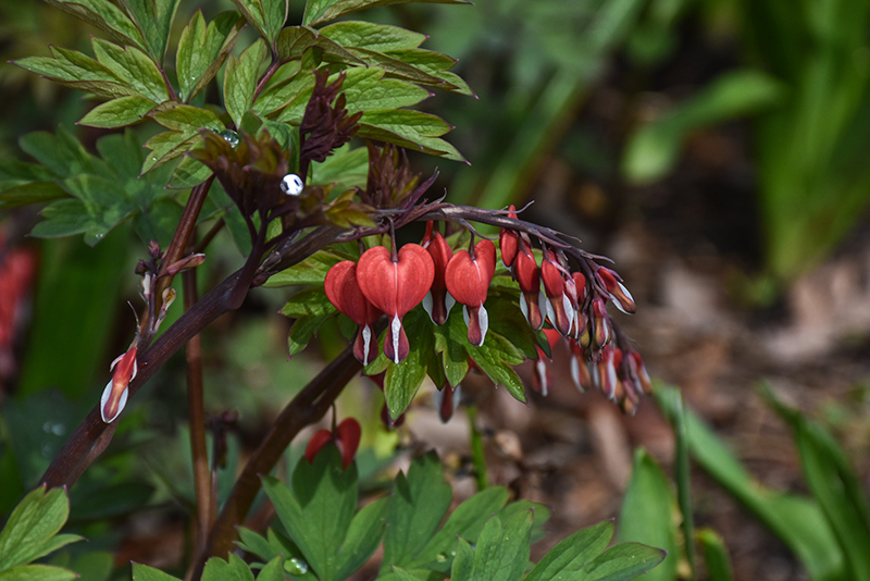 Valentine Bleeding Heart features delicate nodding cherry red heart-shaped flowers with white centers dangling from the stems from late spring to early summer. Its ferny compound leaves remain grayish green in colour throughout the season.