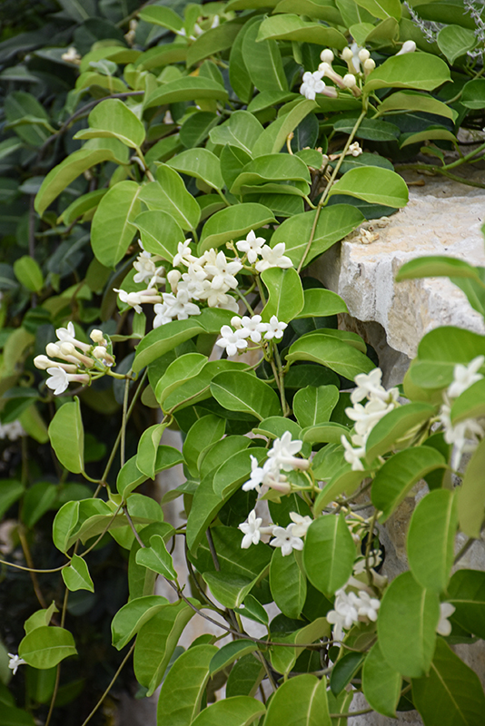 This vigorous climber bears dark green leathery leaves to contrast clusters of pure white tubular blooms that are highly fragrant; largely used for wedding arrangements; grows best in bright indoor areas