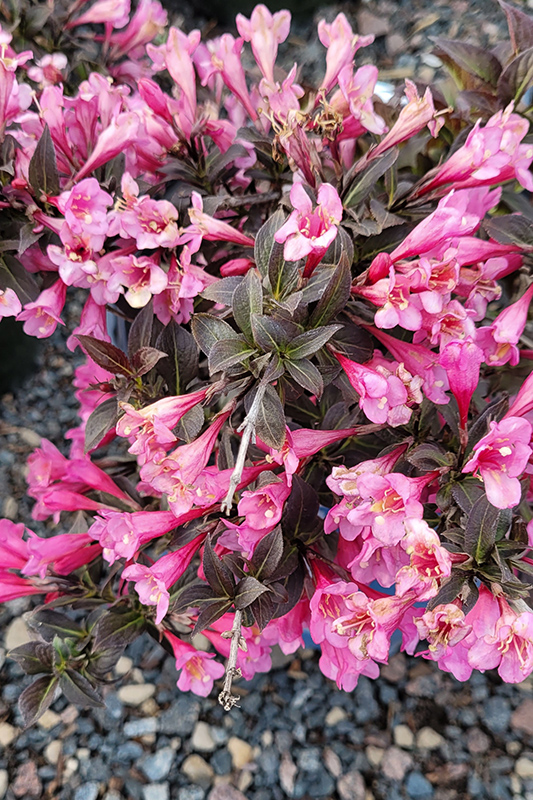 Stunner™ Weigela is covered in stunning clusters of pink trumpet-shaped flowers along the branches from late spring to mid summer. It has attractive grayish green-variegated plum purple foliage with hints of coppery-bronze. The pointy leaves are highly ornamental but do not develop any appreciable fall colour.