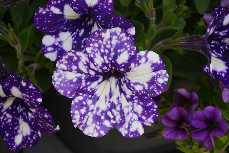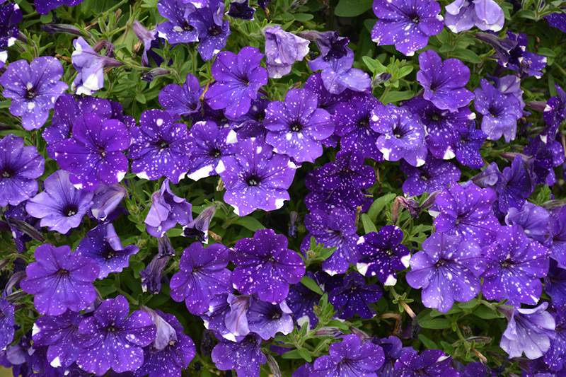 Headliner™ Night Sky® Petunia is bathed in stunning purple trumpet-shaped flowers with sky blue overtones and white spots at the ends of the stems from mid spring to early fall. Its pointy leaves remain green in colour throughout the season.
